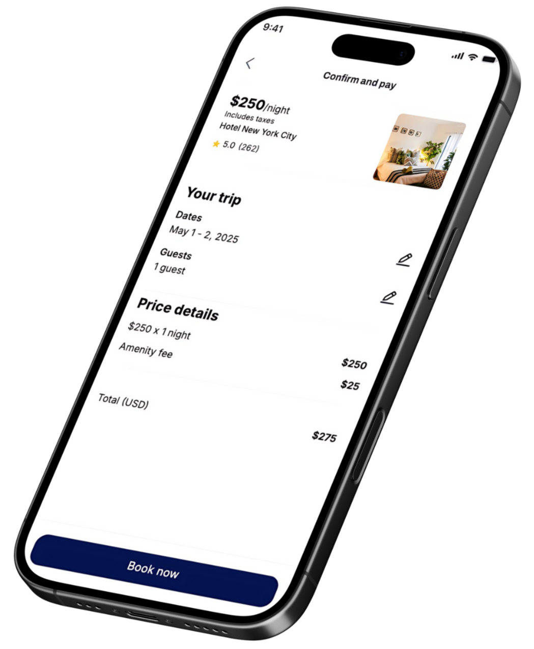 Book stays and activities without ever leaving the app. Our platform accepts Visa, Mastercard, Amex, Google and Apple Pay, as well as Affirm.